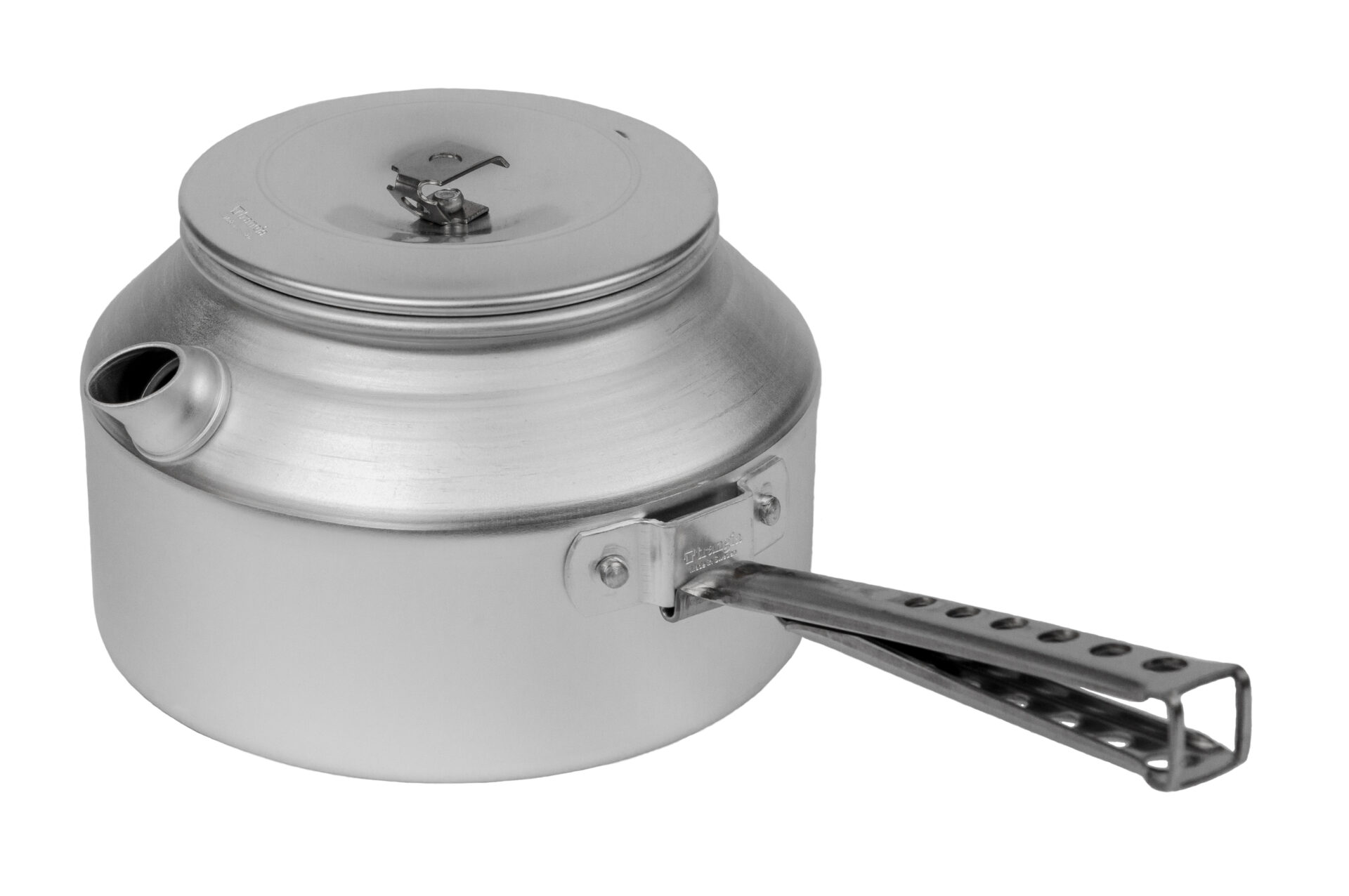Kettle 924, 0.9 L in aluminum with lid and detachable aluminium handle. Handle can be extended with a sturdy stick for use over open fire. This kettle does not fit in Trangia stoves 25 Large and 27 Small. Lid with stainless-steel knob.